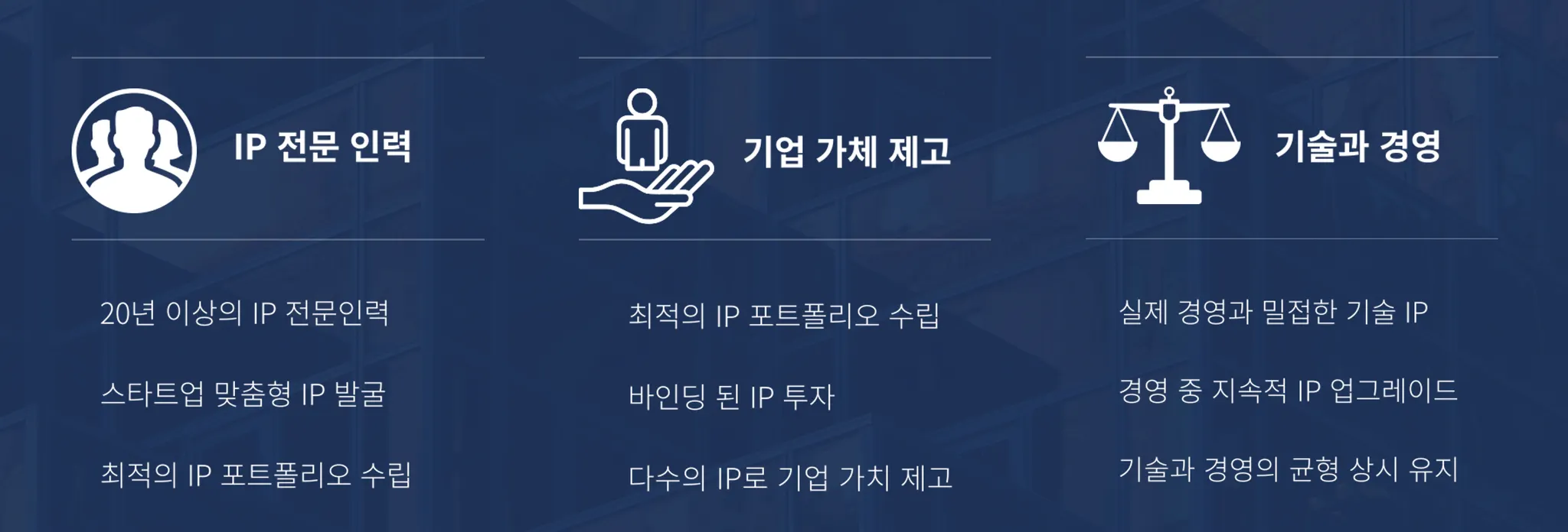 발굴된 스타트업의 아이템과 비즈니스모델 분석에 맞는 IP 포트폴리오를 수립합니다. 기존 IP들을 서베이하여 적정한 IP와 신규 IP를 바인딩하여 스타트업의 기술적인 가치를 제고하기 위하여 투자의 형태로 제공합니다.